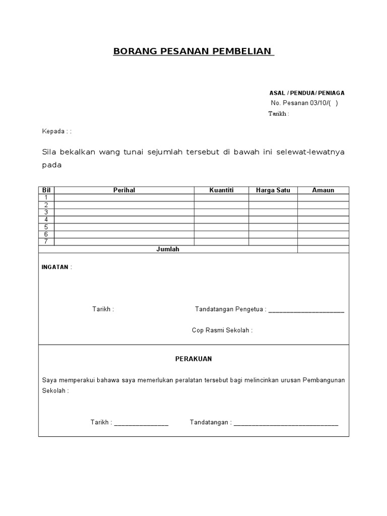 Proses permintaan pembelian digunakan oleh organisasi untuk melaksanakan dan mengesan pesanan bekalan. TARIKH TANDATANGAN COP JAWATAN Untuk diisi sebelum. Dalam menjankan sebuah usaha atau bisnis surat pesanan memang sangat sering dipergunakan.