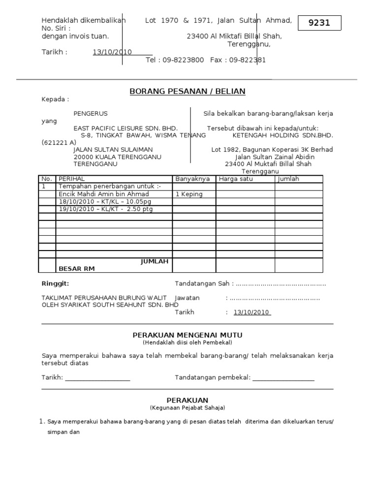 Contoh Borang Pesanan Untuk Syarikat